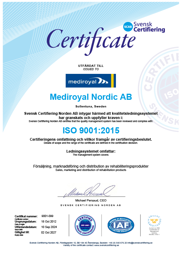 För Mediroyal Nordic AB är ISO 9001 och ISO 14001 inte endast certifieringar utan en naturlig del av vårt dagliga arbete och ett verktyg för att skapa långsiktigt värde för kunder, samarbetspartner och samhället i stort.